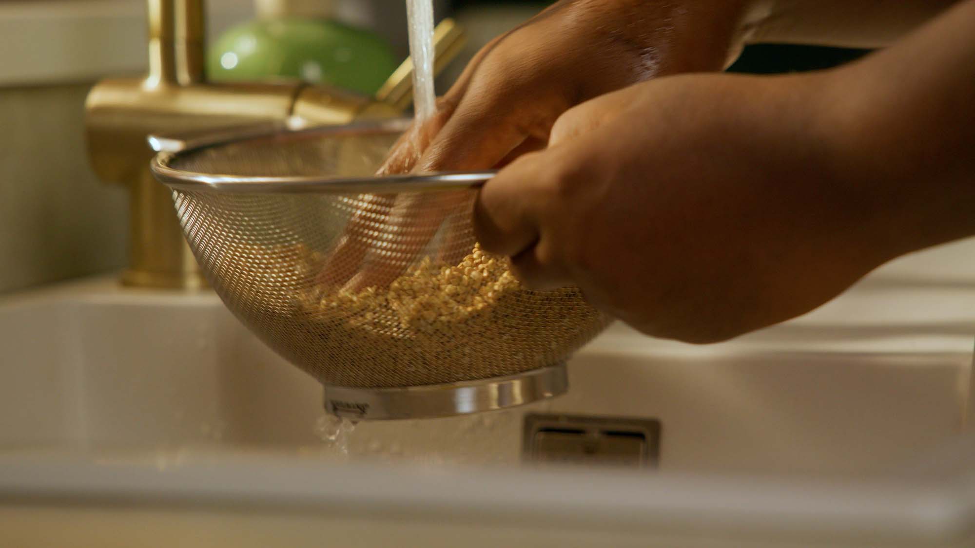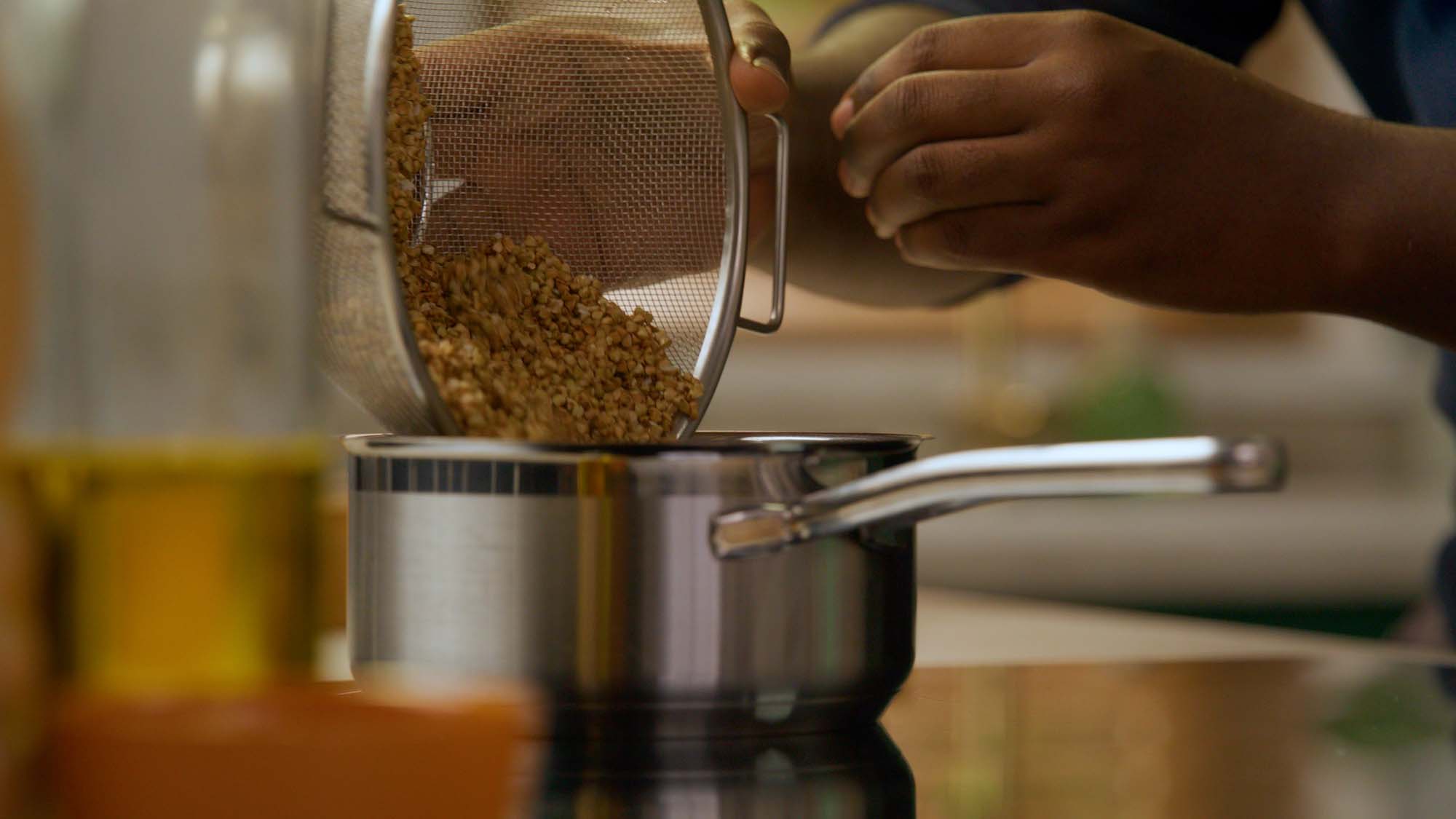 Rinse the buckwheat until the water’s clear. This gets rid of excess starch and any bitter flavours. Drain well before cooking.