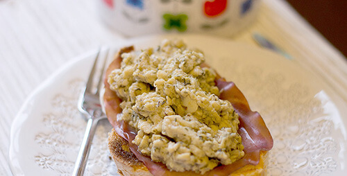 To each piece of toast, add two slices of bresaola and top with the herby scrambled eggs.