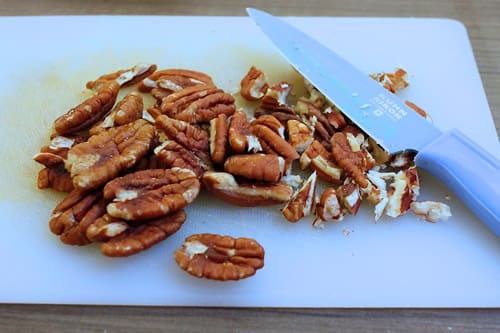 First, set the oven on to 200C/180C fan/gas 6. And while that’s heating up, peel, de-core and slice your apples.