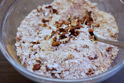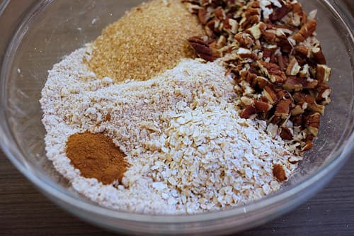 Sticking with your bowl of breadcrumbs, stir in the oats and the demerara sugar. Then, sprinkle the breadcrumb mixture over the apple and berries in the baking dish.