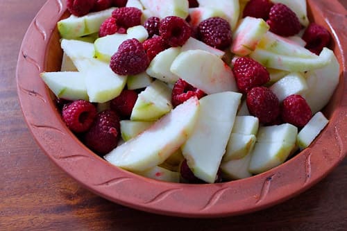 Mix in your raspberries before tipping the fruit mixture into the baking dish. Pat everything down so it covers the bottom of the dish.