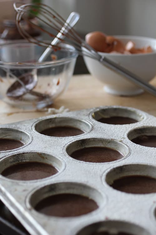 Keep whisking until smooth and then pour them into your muffin tray. Grease up each pot with any leftover butter and sieves a little more flour over the tray before filling up each space 2/3 of the way full. Then cover and put the tray into the fridge for an hour. We need the mix to cool to the point it’s still a liquid but will also leave a gooey middle when cooked.