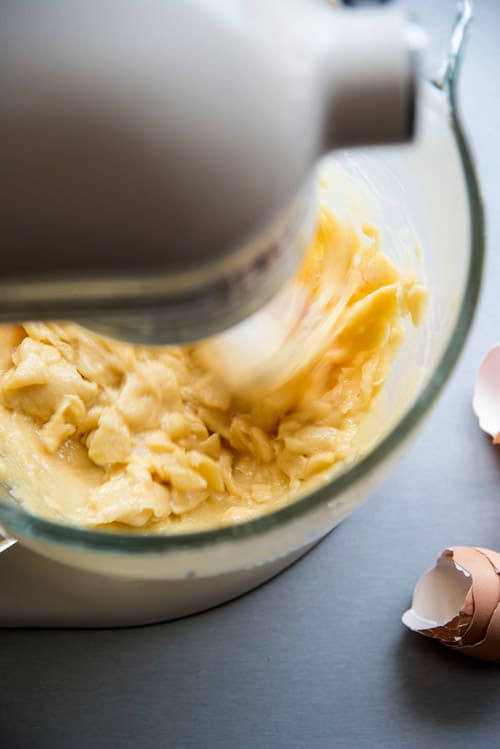 With the paddle attachment, keep whisking the dough whilst adding the 4 eggs one by one until it’s all combined and smooth. Transfer into a piping bag with a large, round nozzle.