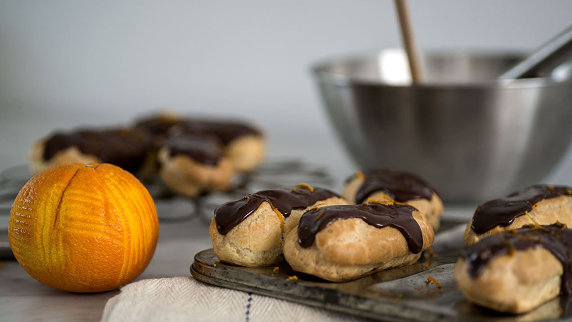 Now apply the glaze on top of each éclair. Leave to harden for about 5 minutes before grating a little more orange zest on top for decoration.