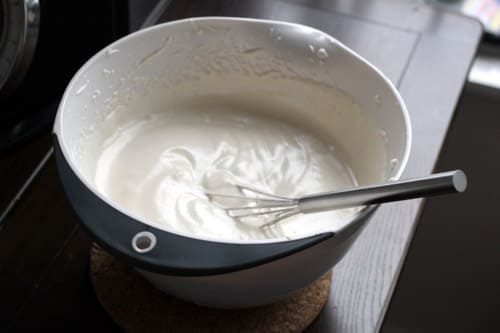 Mix the eggs and sugar in a heat proof bowl and whisk over simmering water until they're thick and pale.