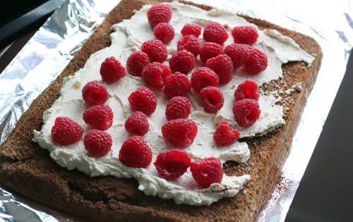 Almost there - Whip your cream with the icing sugar until thick and spread onto the now cooled sponge. Scatter the raspberries on top and re-roll the roulade.