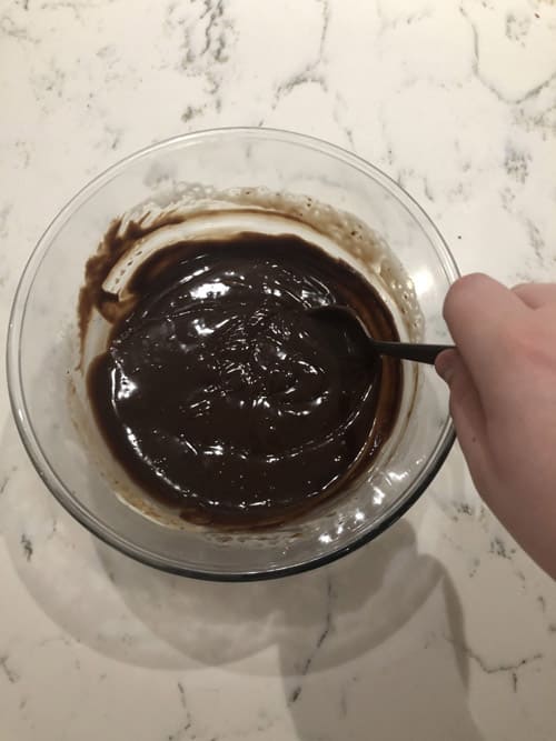 Add the cream to a bowl and add the chopped chocolate. Microwave this for 45 second intervals until the chocolate has melted. The ganache should be thick and shiny. Then place this into the fridge to cool it down. It will set very firm but if it is too firm microwave it for 15 second intervals until it is a workable consistency.