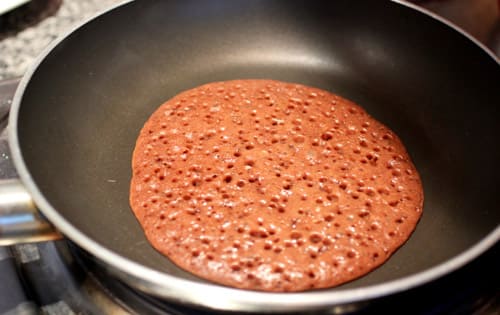 Depending on how good your non-stick pan is (and I was tempted to go out and buy a new one) you might just be able to flip your pancake, but the cocoa will conspire against you. It’s worth it though for the chocolatey goodness though.