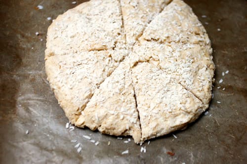 Mix together using your hands to form a soft dough that just comes together – don’t overmix. Shape the dough into a round about 2cm thick. Brush with a little extra coconut milk and sprinkle with some more desiccated coconut. Slice the round into eight pieces with a sharp knife, cutting nearly all the way to the bottom.