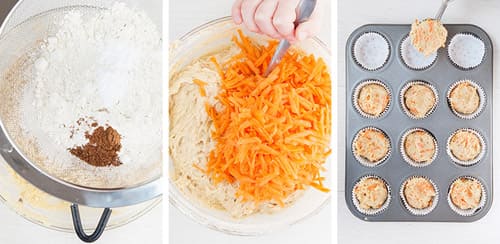 Sift in the flour, mixed spice and baking powder. Grate the carrots and stir into the mix. Divide the batter between 12 cupcake cases. These muffins don’t rise much, so you’re safe to fill the cases to approx. 1cm from the top. Bake in the oven for 20 minutes until just firm. Leave to cool completely on a wire rack.