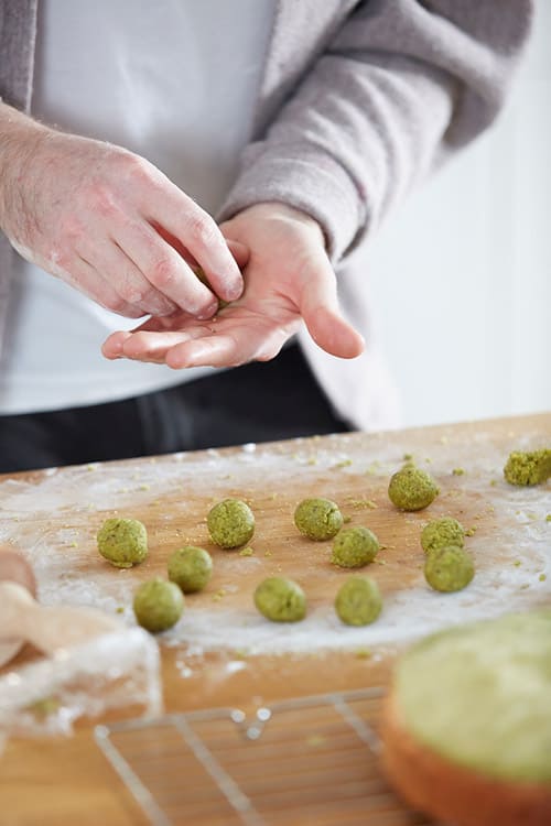 Trim the top of the cake so you have a flat top for the marzipan to sit on. Roll out two-thirds of the pistachio marzipan to a circle to fit the top of the cake. I rolled out the marzipan and used the base of the cake as a template and cut around it to form a perfectly sized disc Brush the top of the cake with a little warm apricot jam or honey and set the marzipan disc on top.