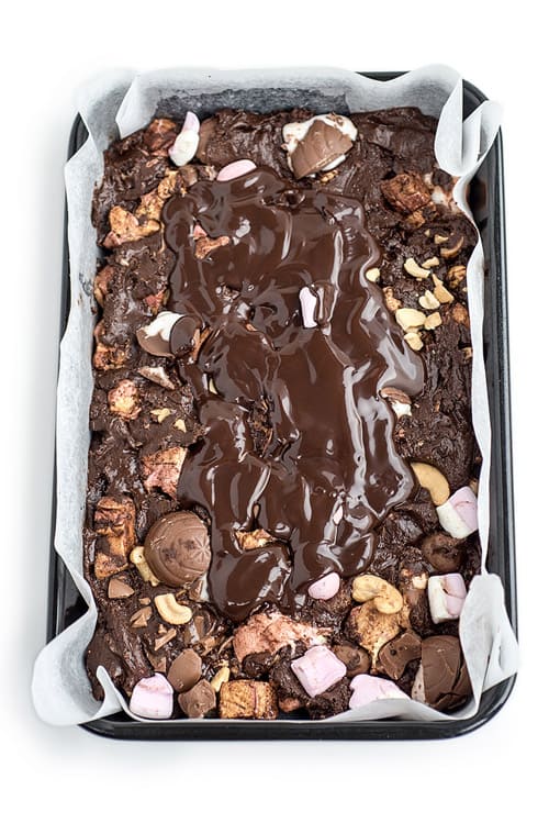 Add the cooking chocolate and butter into the bowl you were using earlier and melt it using the double boiler method. Spread the chocolate over the rocky road to fill in any gaps then top with the reserved candy.