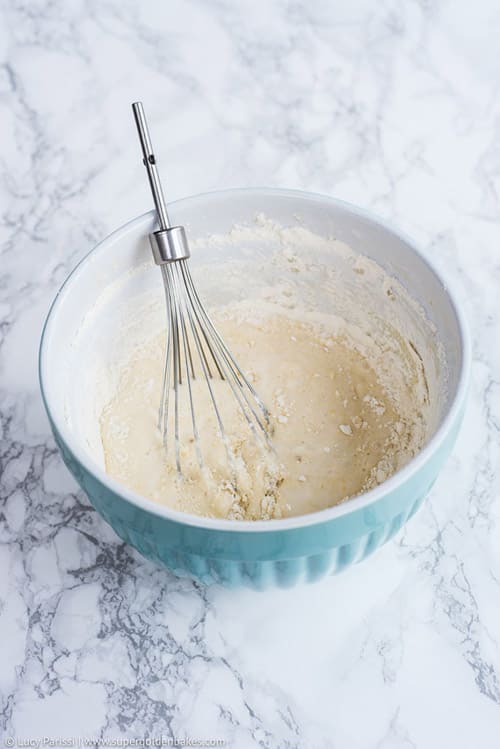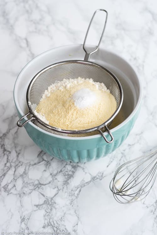 Combine the flour, semolina, salt and bicarbonate of soda and sift over the bowl.