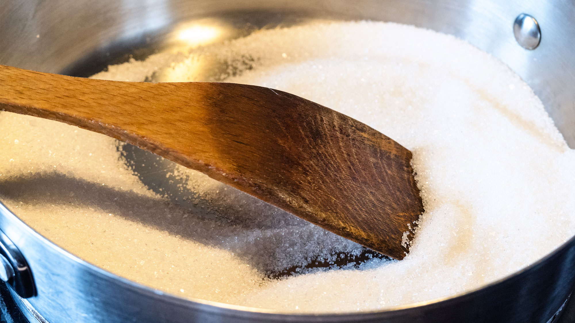 In a medium saucepan over low heat, combine the sugar and corn syrup (or honey). Stir gently until the sugar dissolves. Clip on a sugar thermometer and raise the heat to medium. Without stirring, let the mixture bubble until it reaches the hard-crack stage, about 150 °C.