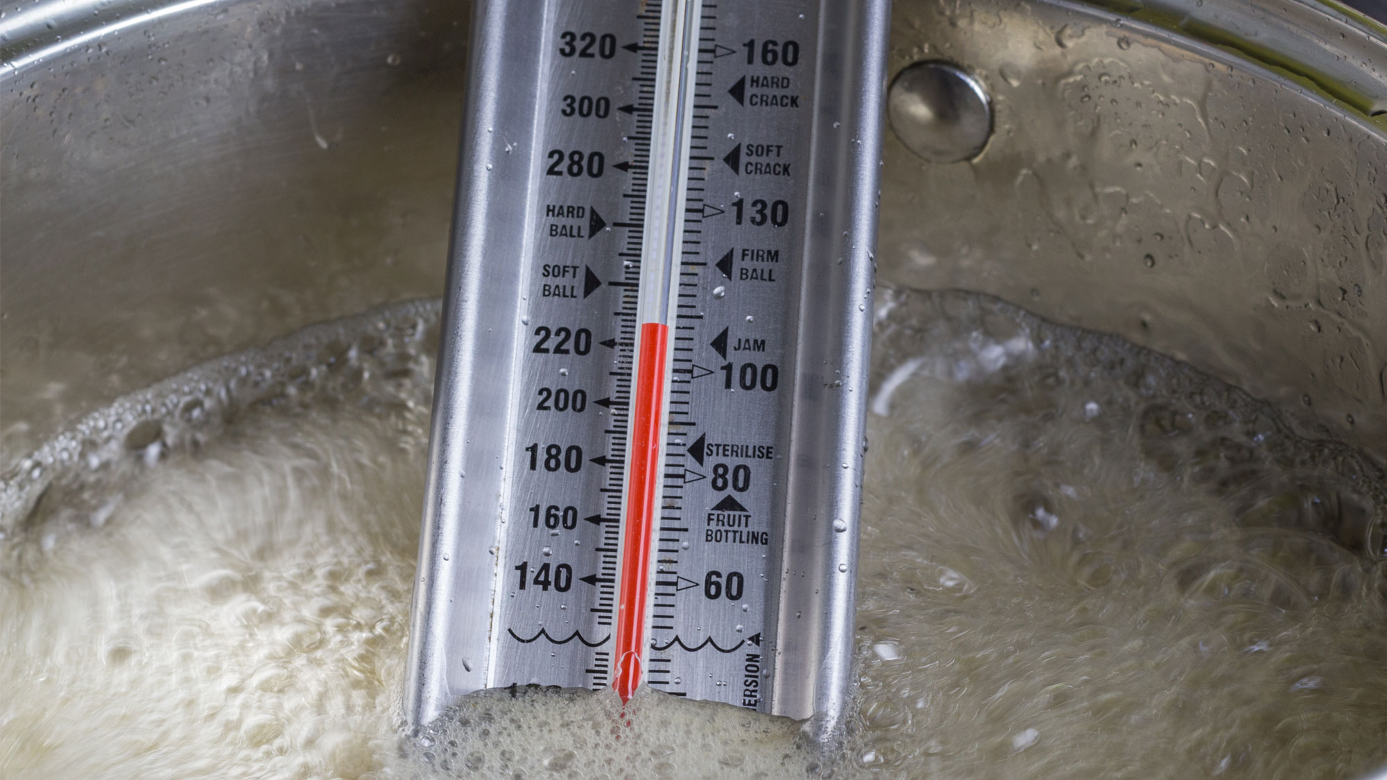 As soon as the temperature hits 150 °C, remove the pan from the heat. Stir in the vanilla extract and a drop of white food colouring to create a pale, opaque base for your marble effect.