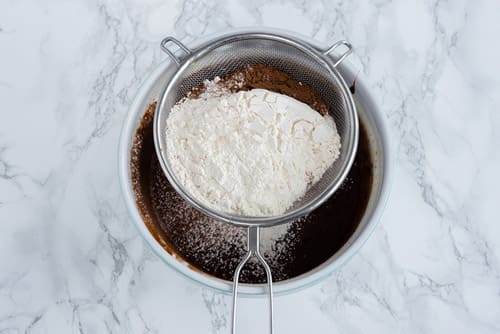 Sift the flour and cocoa into the chocolate and fold together with a spatula.