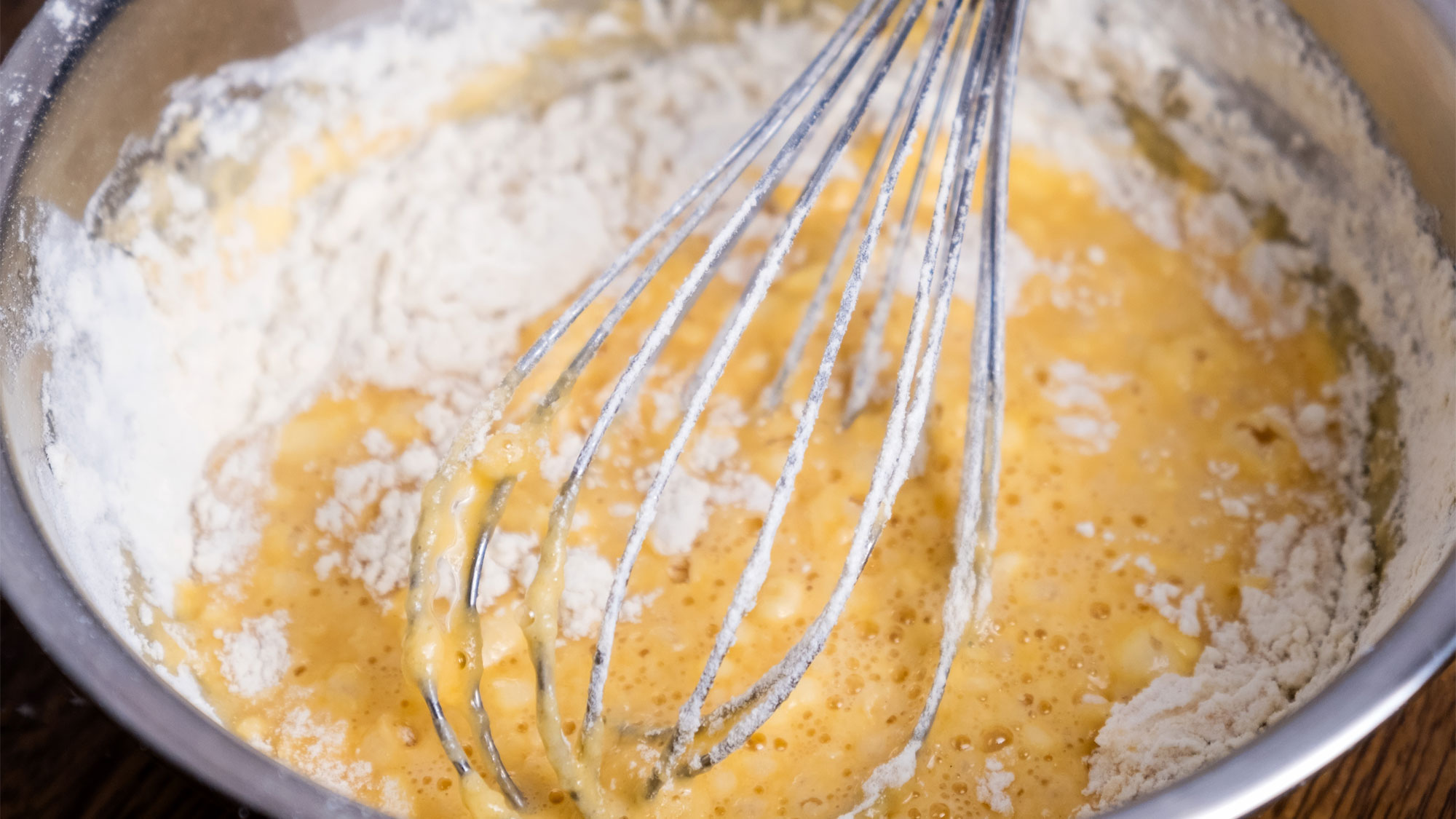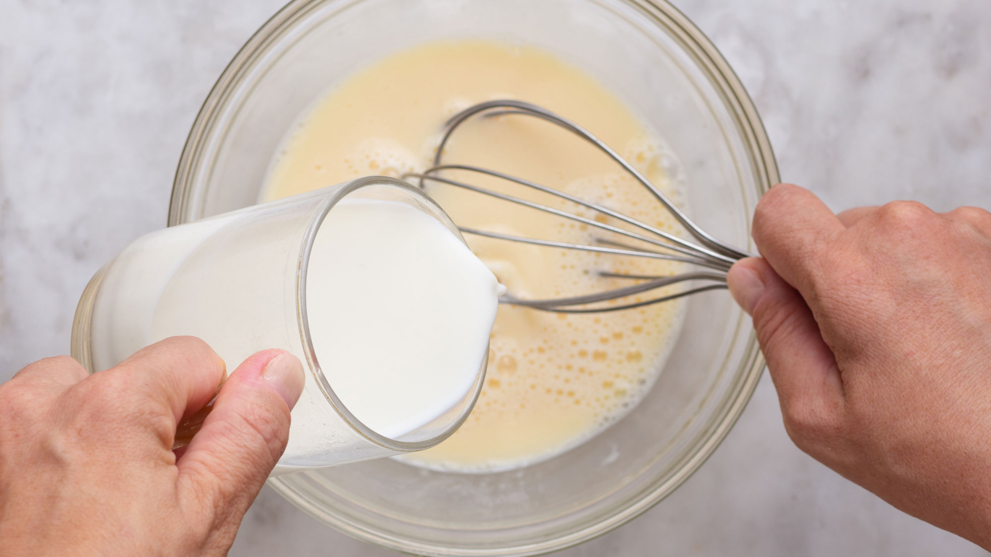 Slowly pour in the milk while whisking so it blends smoothly with the egg mixture. Then add the melted butter (or oil) and give everything a quick mix to bring it all together.