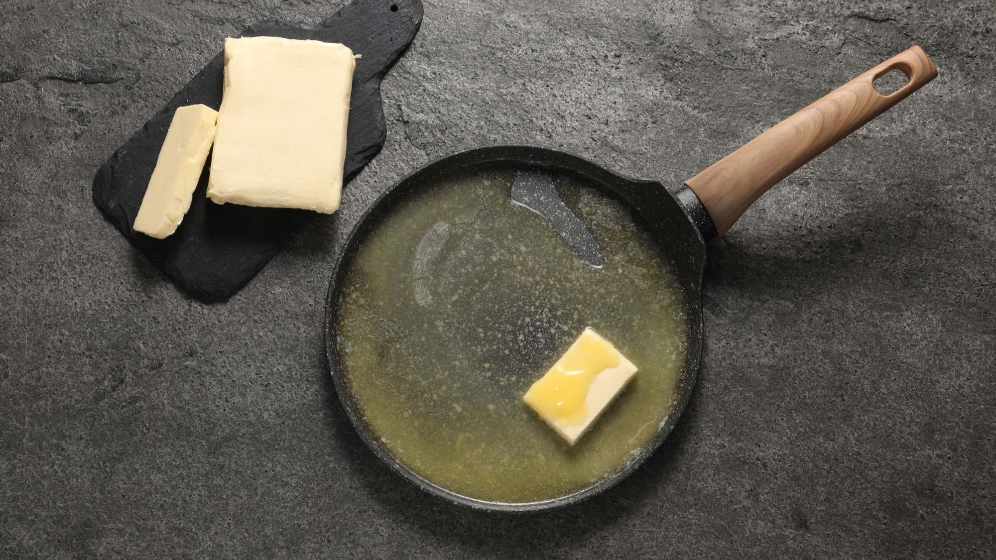 Carefully take the hot pan out of the oven (it’ll be very hot, so oven gloves are a must). Add 2–3 tablespoons of clarified butter or oil and swirl it around to coat the base.