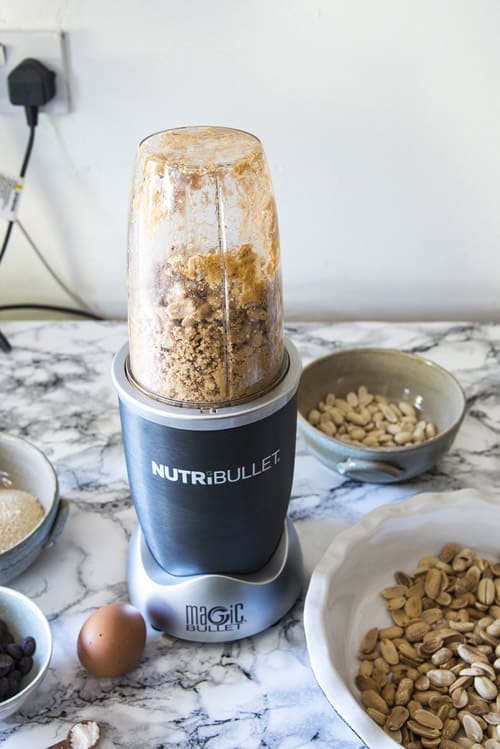 Now pour the peanuts and the honey into the Nutribullet and blend for a couple of minutes.