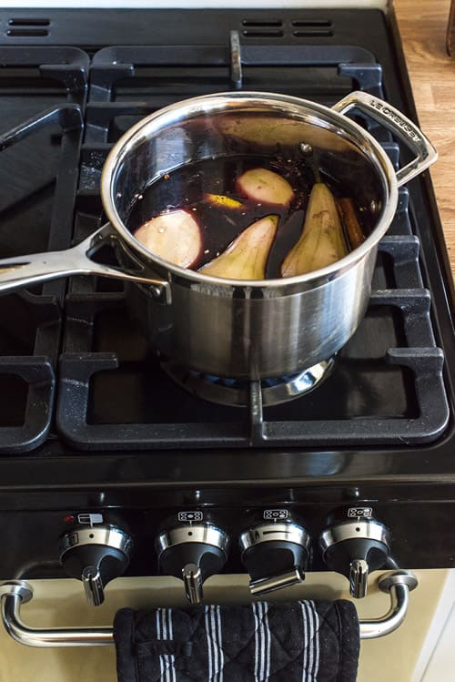 Stir the ingredients until they’re combined, then, peel the pears leaving the stalk intact then carefully cut a flat bit off the bottom of each pear so that they can stand up. Add them to the saucepan and bring to the boil.