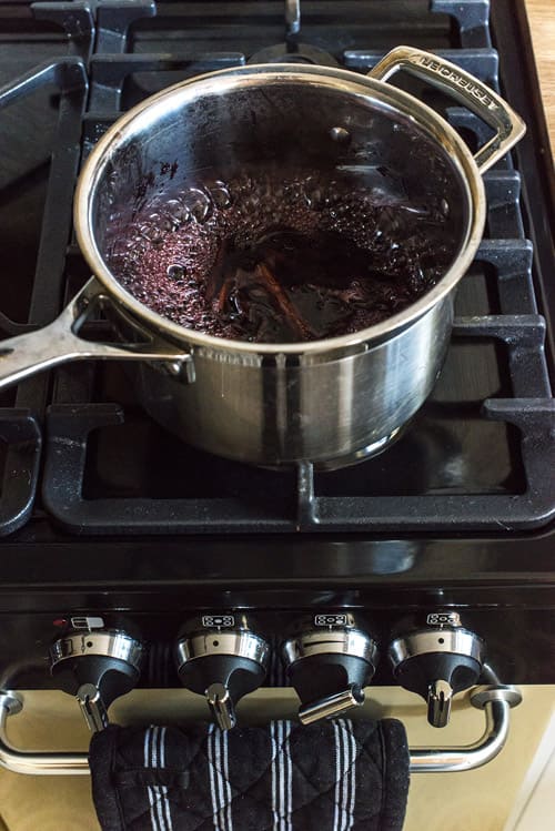 Once done, carefully remove the pears and bring the liquid to a slow boil for 5-10 minutes and reduce to a syrup.