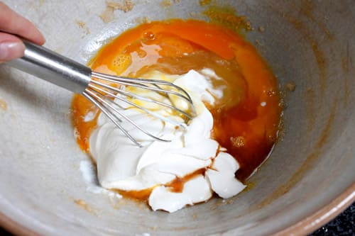 Pre-heat the oven to 180C. In a large bowl, whisk together the butter and sugar.