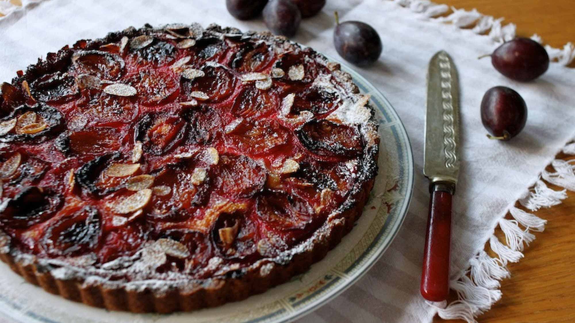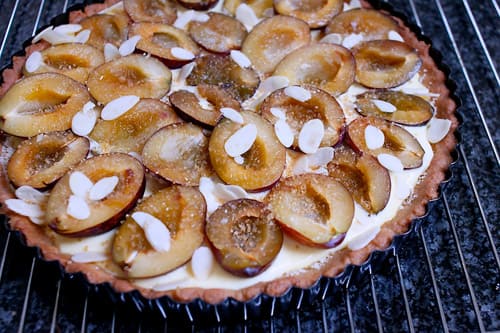 Halve and stone the plums (quarter them if they’re large) then arrange over the filling.