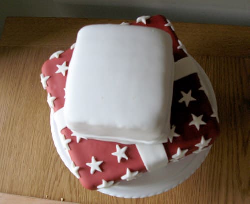 Massage your white icing and roll this out into a flat circle roughly 2cm high. Using a knife cut two long strips, roughly one inch wide and 16 inches long and place in a cross shape over your cake to form a ribbon. Using a star cutter, press out roughly 50 stars and stick these onto your red iced cake. If the stars don’t stick then simply apply some water to the back of them, this will form glue.