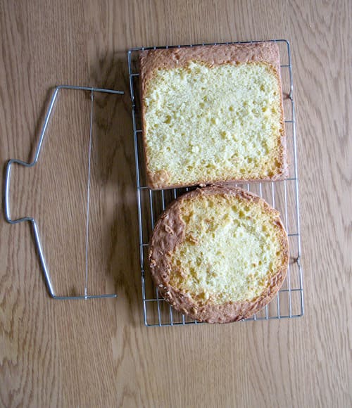 Using a knife or a cake leveller, you can slice any raised bits off your cakes to give you a straight, flat finish.