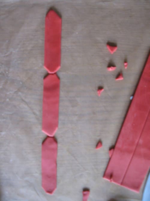 Massage your excess red icing to bring it back together and re-roll it into a flat circle roughly 2cm high. Using a knife cut two long strips, roughly one inch wide and 9 inches long and place these to one side.