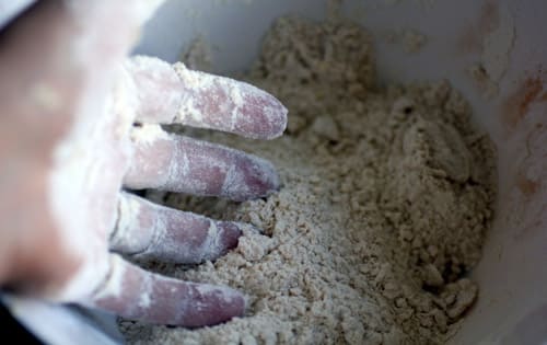 Add the butter and rub it into the flour. Really try to make sure all the butter has been mixed into every part of the flour. Add the milk, sugar and raisins and mix well into sticky dough.