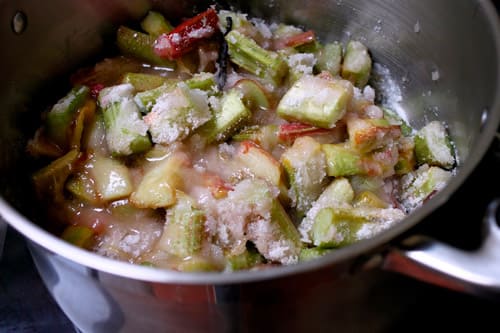 Cut up your rhubarb into small chunks and give them a rinse. Place these in a pan along with the sugar, cover and leave overnight.