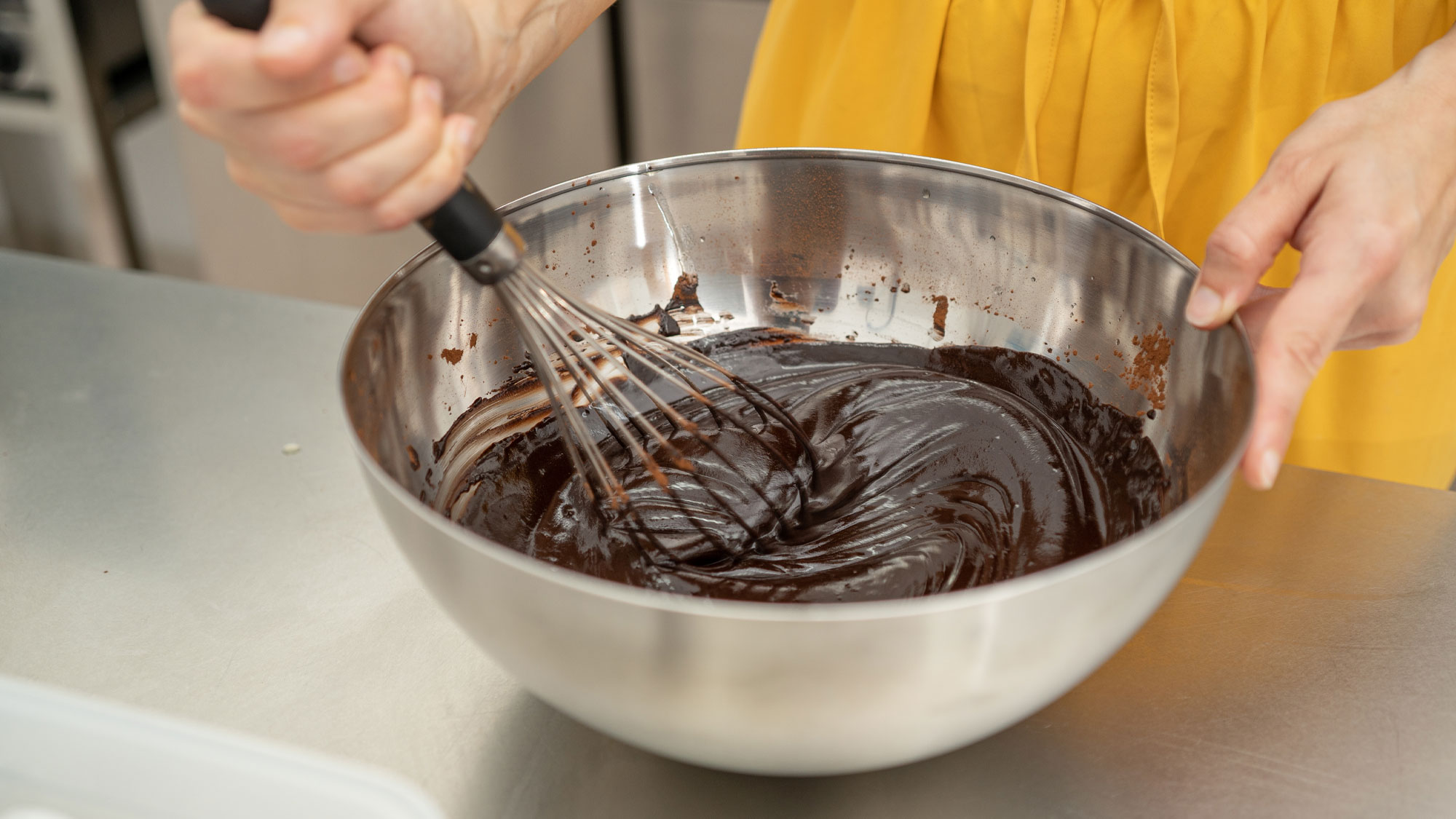 In a heatproof bowl over a pan of simmering water, gently melt the chocolate and butter together. Stir until smooth, then remove from the heat and let it cool for a few minutes.