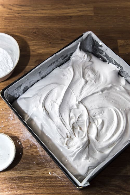 Once the mix is close to reaching the required temperature start mixing the gelatine and water. It will turn quite thick and the whisking will help to break it up. The sugar should now have reached 115C. Take the pan off the heat and – with the mixer still whisking on a low speed – slowly pour the sugar mix along the side of the bowl into the gelatine.