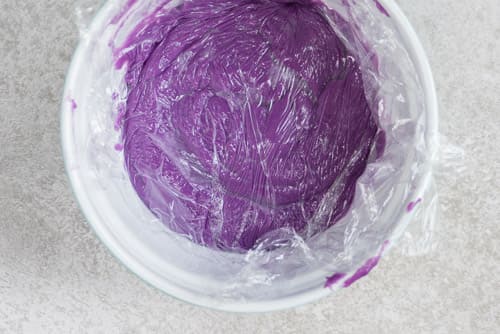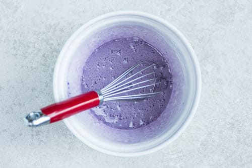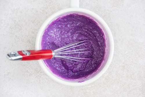 Make the pastry cream first. In a bowl, whisk together the sugar, cornflour, eggs, Ube flavouring and food colouring using a balloon whisk.