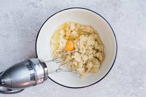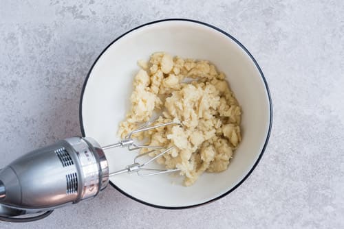 Transfer the dough into a bowl and add the sugar. Beat with a hand mixer until mixed in and the dough has cooled down slightly.