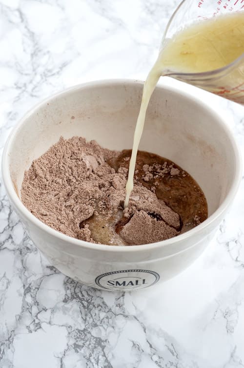 Add the milk, vegetable oil, vinegar and chocolate extract if using into measuring jug and stir together.