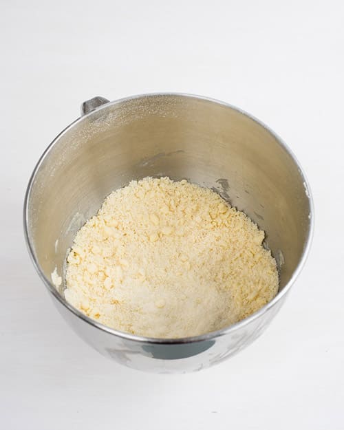 Add the flour, sugar, baking powder, bicarbonate of soda and salt to the bowl of a food processor fitted with a metal blade or in the bowl of a stand mixer fitted with the paddle attachment. Add the cubed butter and pulse or mix until the mixture resembles sand.