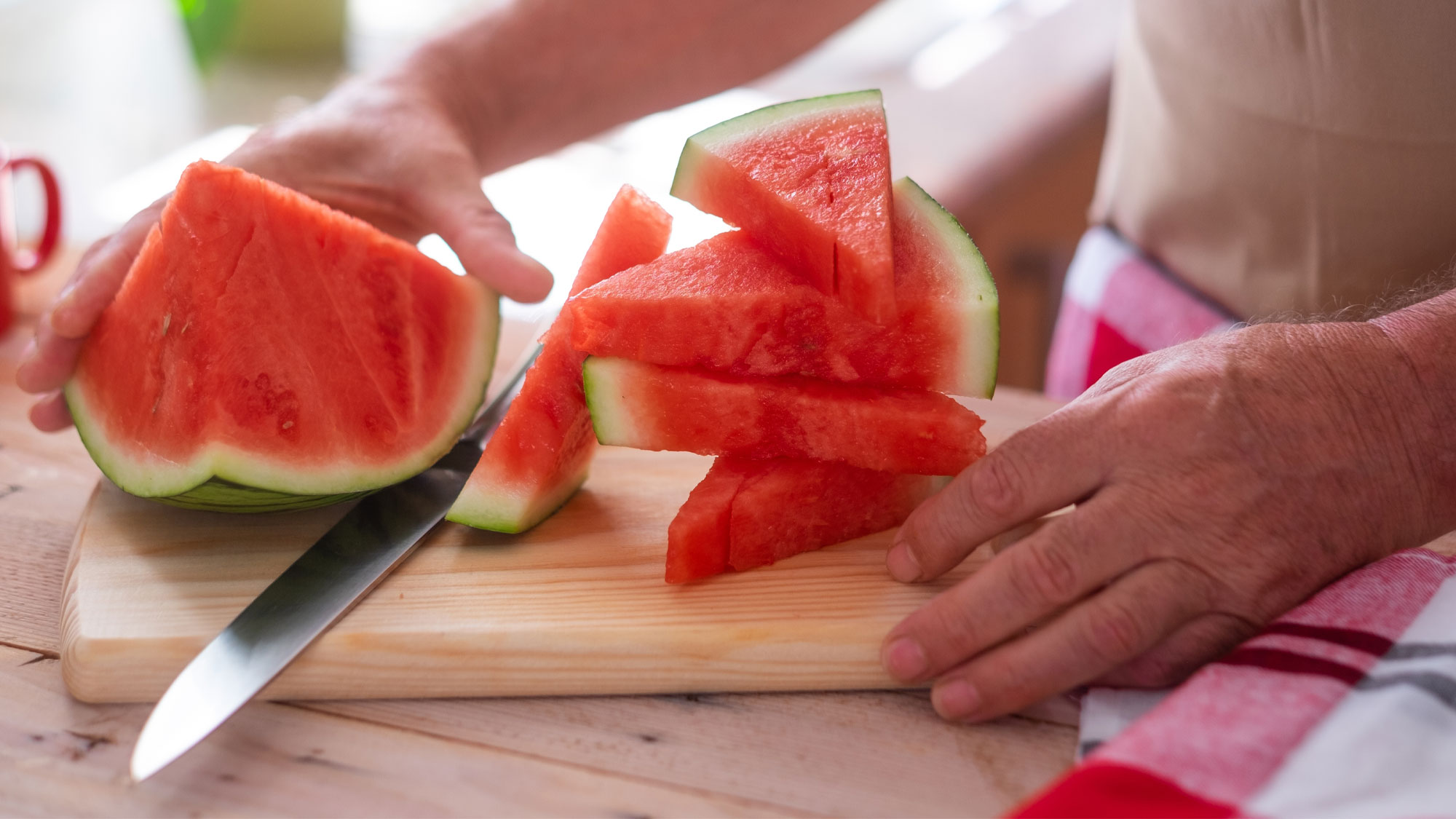 Cut one thick, round slice from the middle of the watermelon—this will be your “pizza base”. Aim for about 1–1.5 inches thick so it holds its shape. Lay it flat on a chopping board.