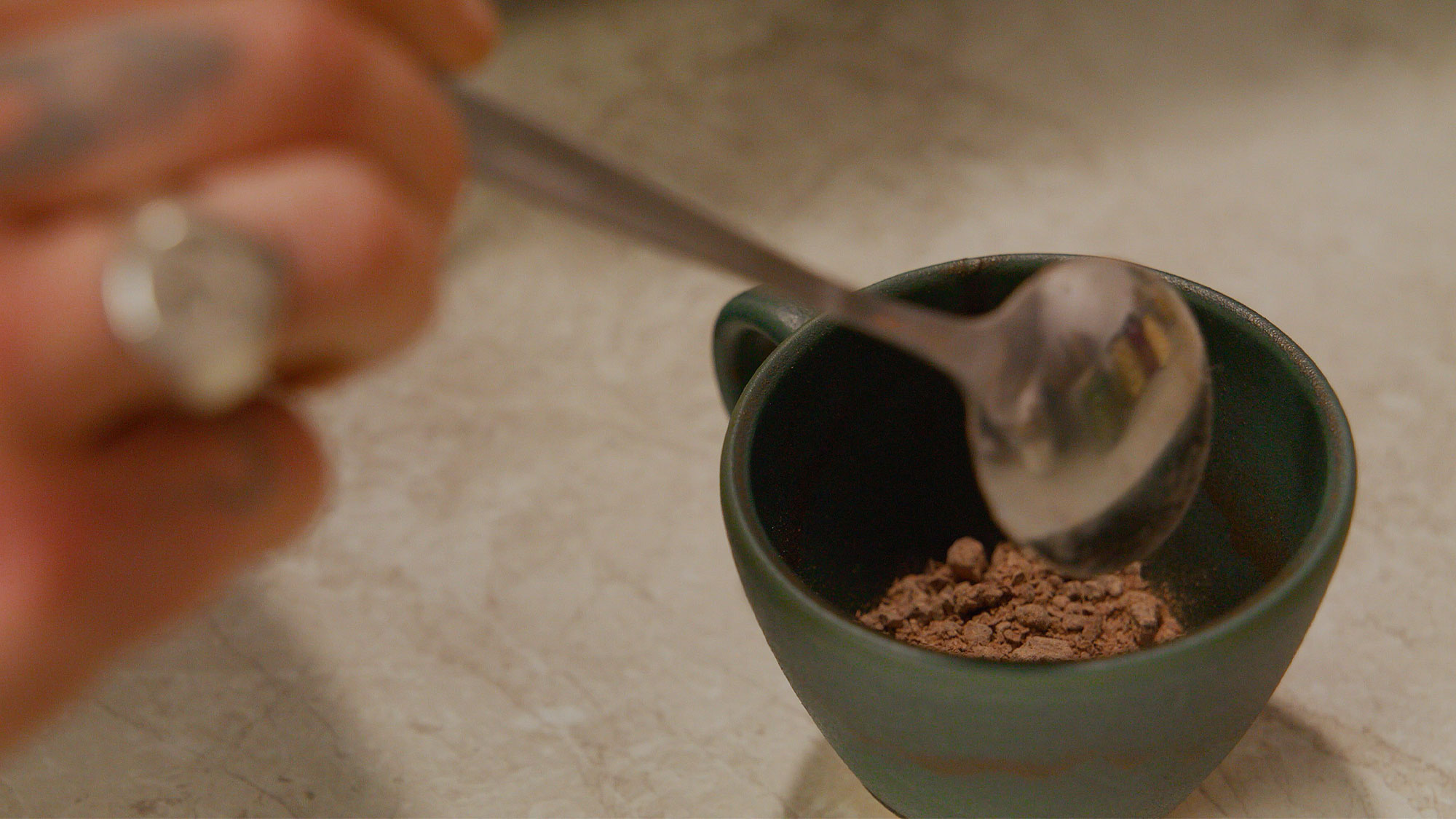 Add a couple of scoops of flaked chocolate to your cup, brew a double shot of espresso and pour on top of the chocolate. Mix until smooth.