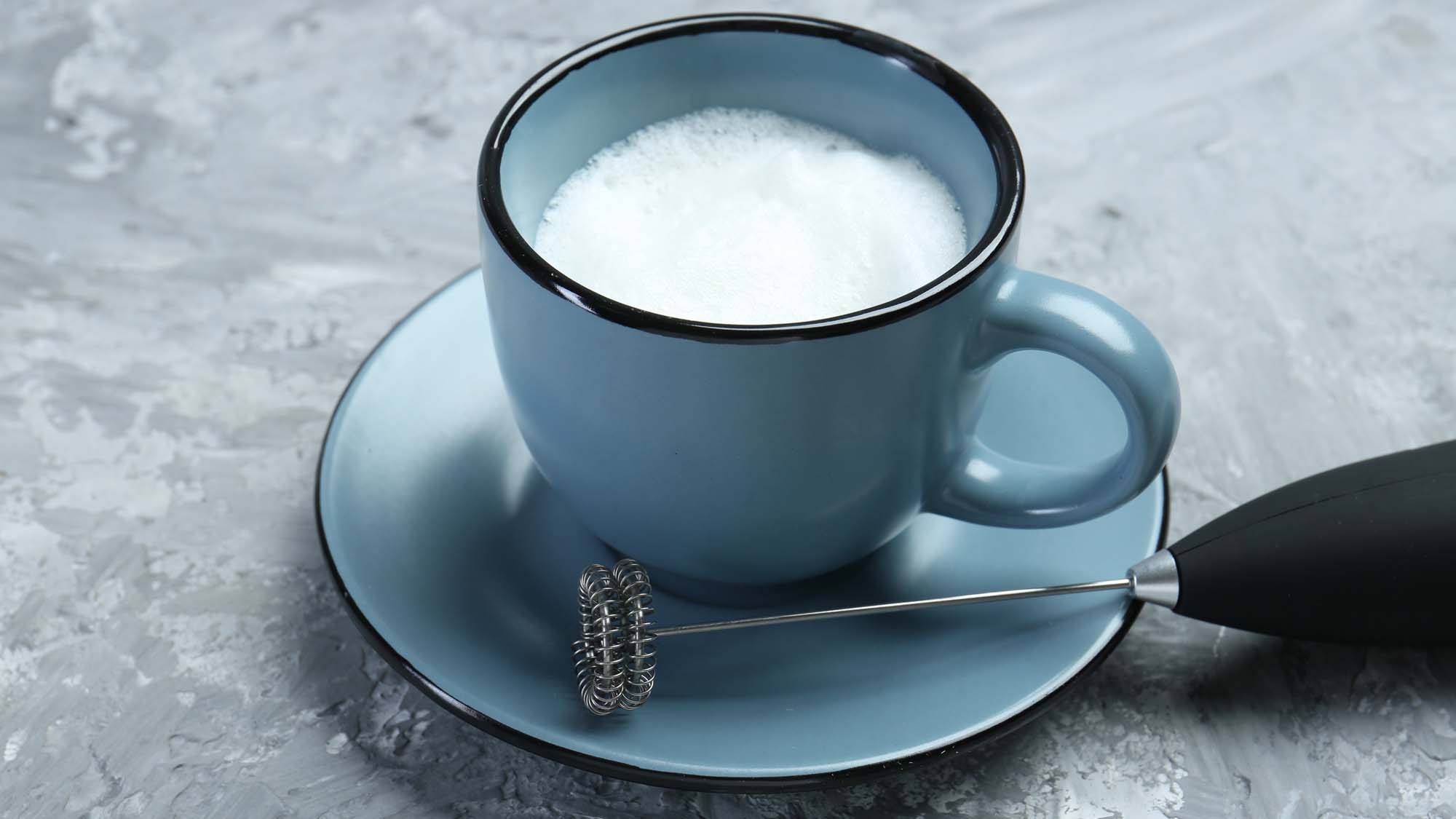 Heat ¼ cup of milk (on the hob or in the microwave) until steaming but not boiling. Froth it with a handheld frother (or whisk like you mean it) until you have lovely, billowy foam.