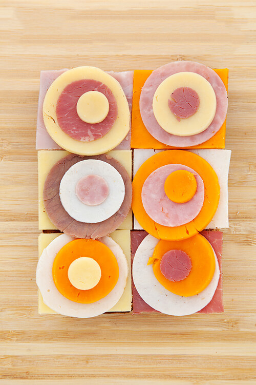 Cut out six rectangles (large enough to cover one slice of bread), plus six large circles, six medium circles and six small circles. Vary the meat/cheese types for full artistic effect.