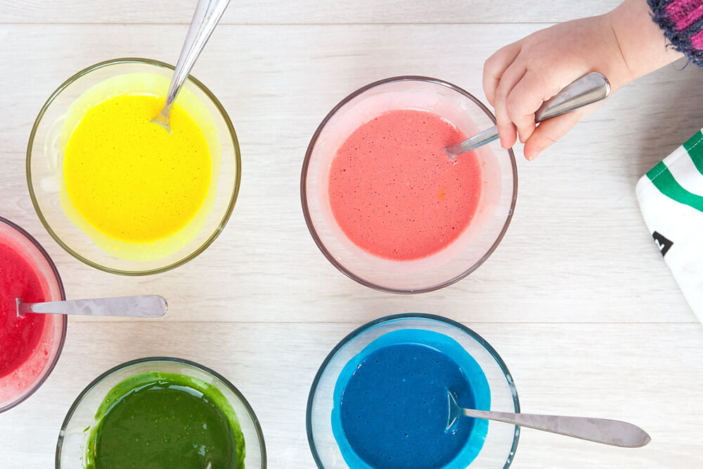 Set up bowls with about half a teaspoon of food colouring in each. We used five colours (blue, red, pink, green and yellow) for this, but you could be really exact and try for the seven colours of the rainbow, it’s up to you and your little ones! Divide your pancake mixture evenly between each of the bowls.