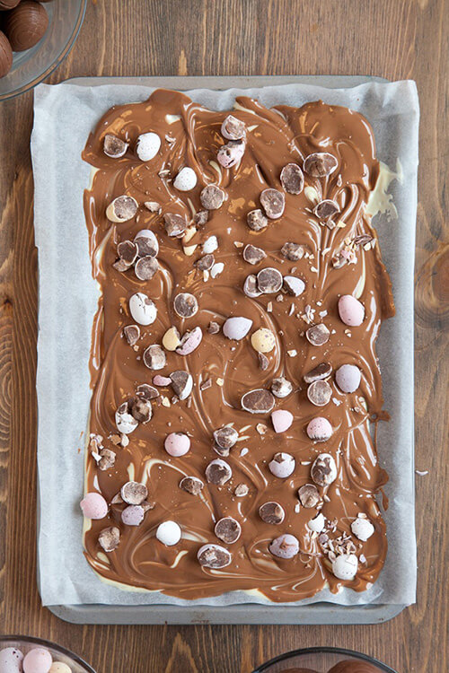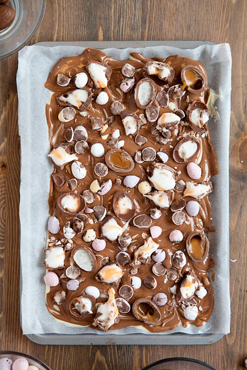 Dot the crème and caramel egg pieces all over the bark. Place the tray in the freezer for 10 minutes to set and you’re done!