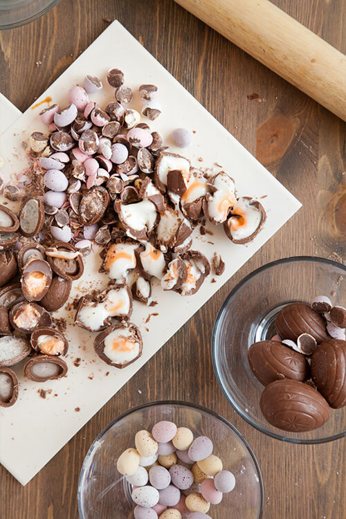 Place the mini eggs in a small bag and bash with the end of a rolling pin so that they break up into pieces.