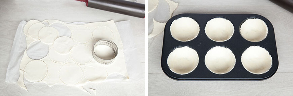Meanwhile, unroll your puff pastry sheets and use a rolling pin to make them a bit bigger. Cut out twelve 9cm rounds from each sheet (twenty-four rounds in total). Press the rounds into the base of a twelve-hole muffin tray (I used two six-hole trays) and press around so the edge of the pastry reaches the rim.