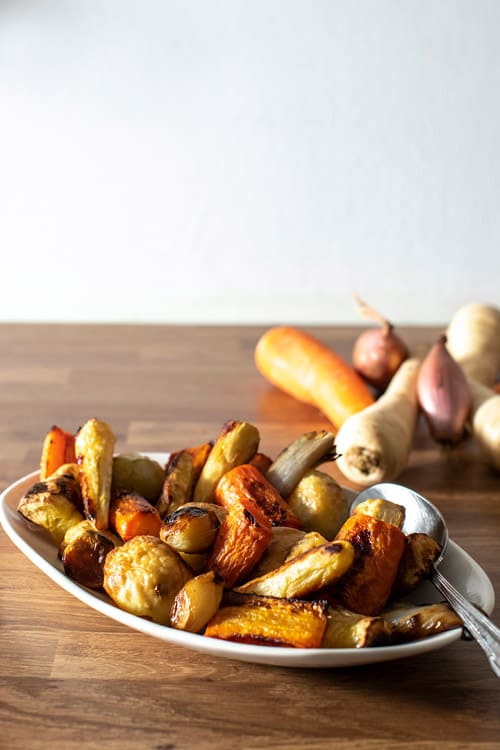 To roast vegetables perfectly, it’s important to use vegetables that need roughly the same roasting time. That means that you will have problems when combining carrots and mushrooms for example, but will get the best results by roasting carrots with parsnips and potatoes. You should also give the vegetables enough space on the tray to not overlap.