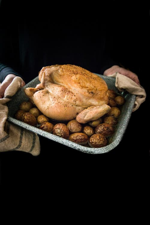 Place a small rack inside the roasting tin and the chicken on top. Roast according to weight. Before serving the chicken (or other meat), get it out of the oven and cover in tinfoil and a tea towel to keep it warm. Rest for 10 minutes (which also gives you time to assemble all the other components) before carving.