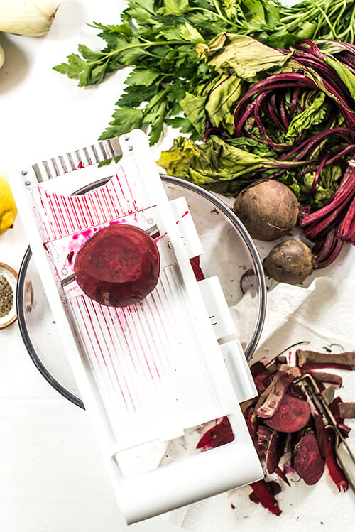 Take the tops off the beetroot, peel them and then finely slice them either with a knife or a mandolin. Put the slices into a large bowl.