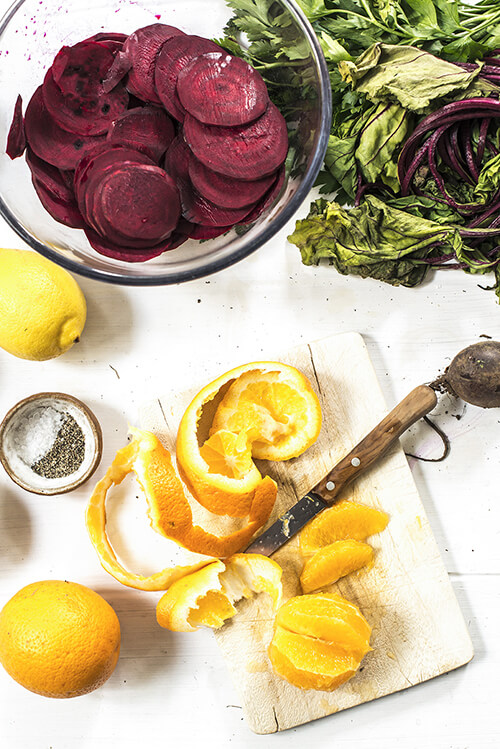 Peel the oranges making sure you remove all the pith, then cut the segments out one by one, again removing any pith. Add to the beetroots.